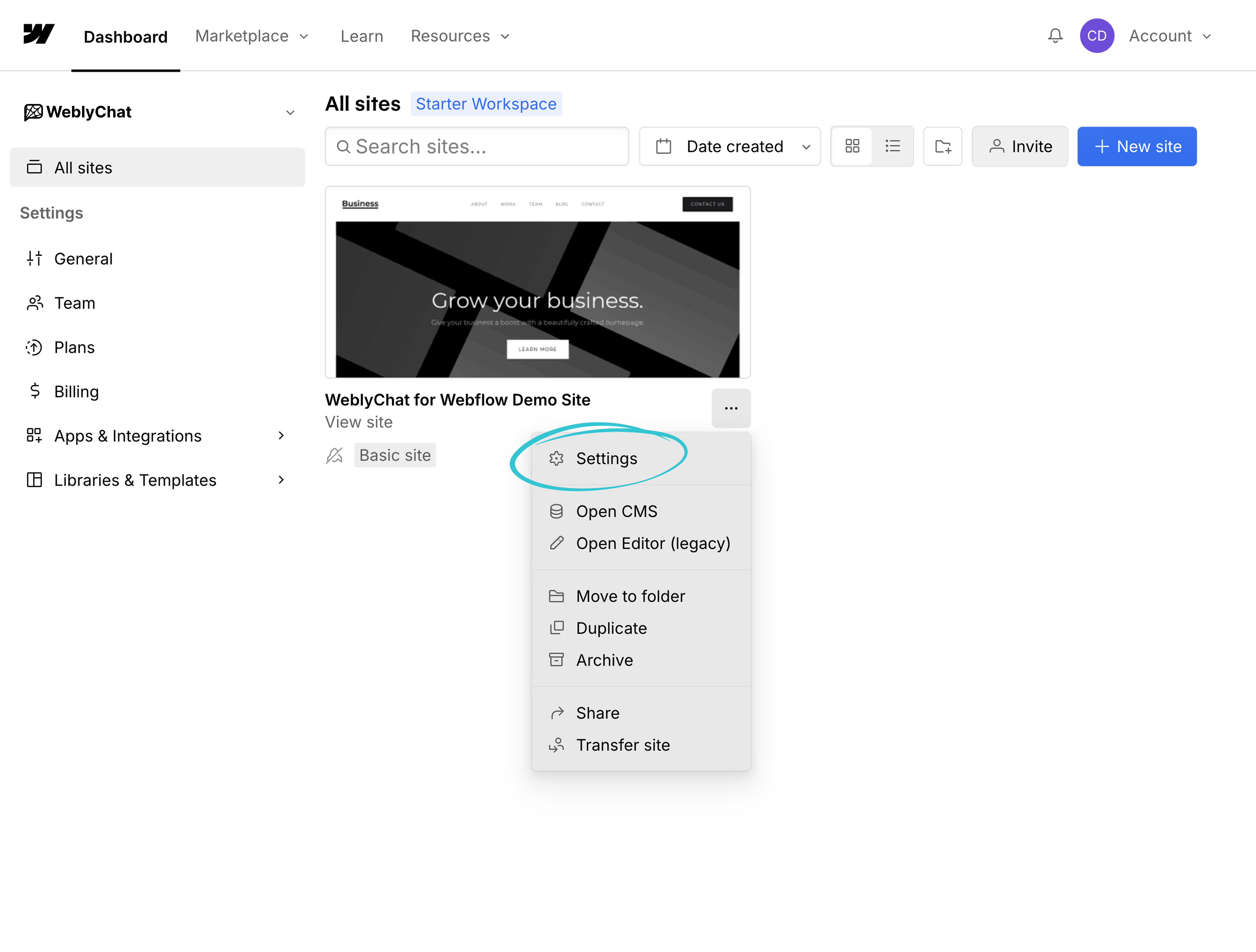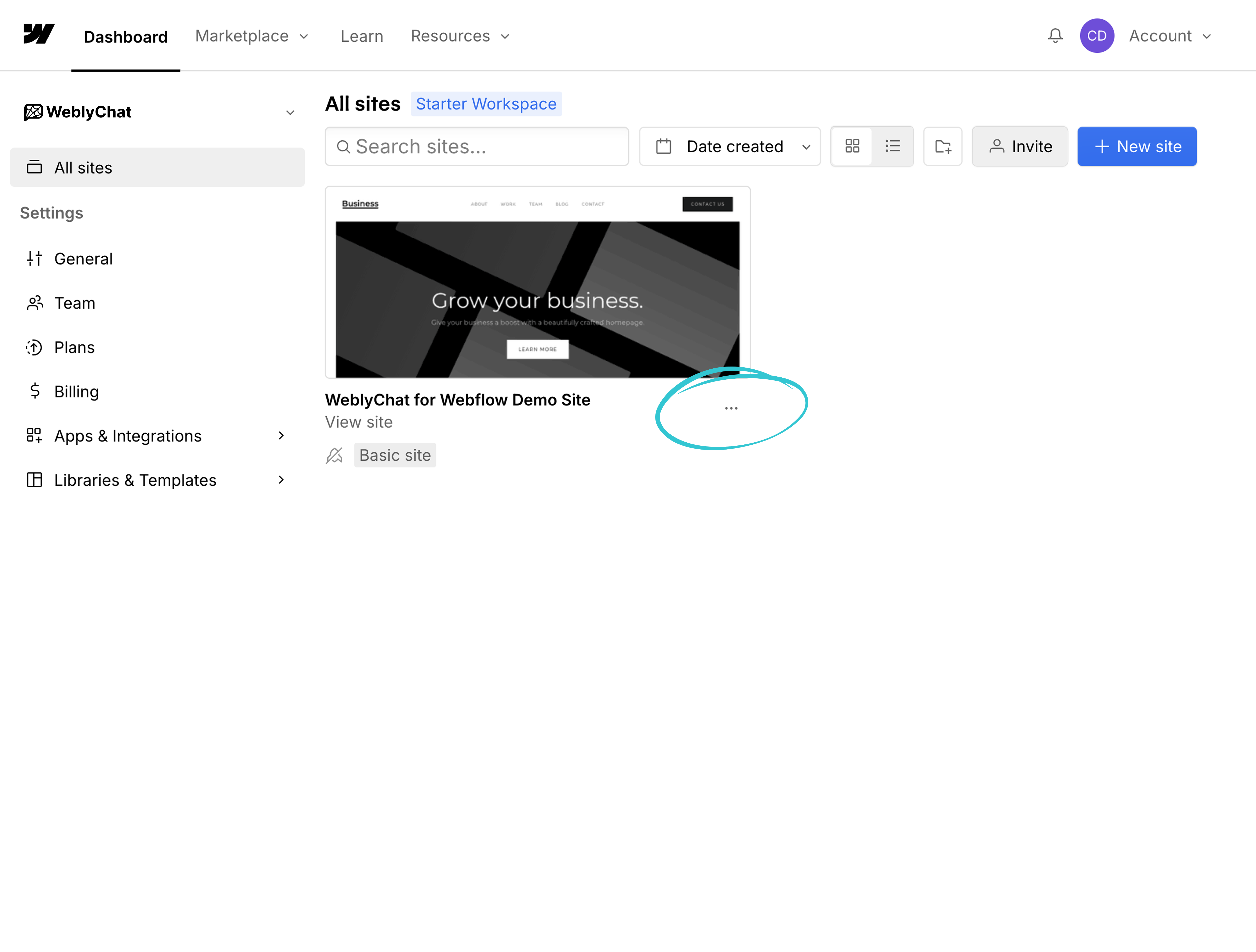 1. In your Webflow dashboard, find the site you want to add the chatbot to. Click the three-dot menu ("...") next to the site name on the site card.