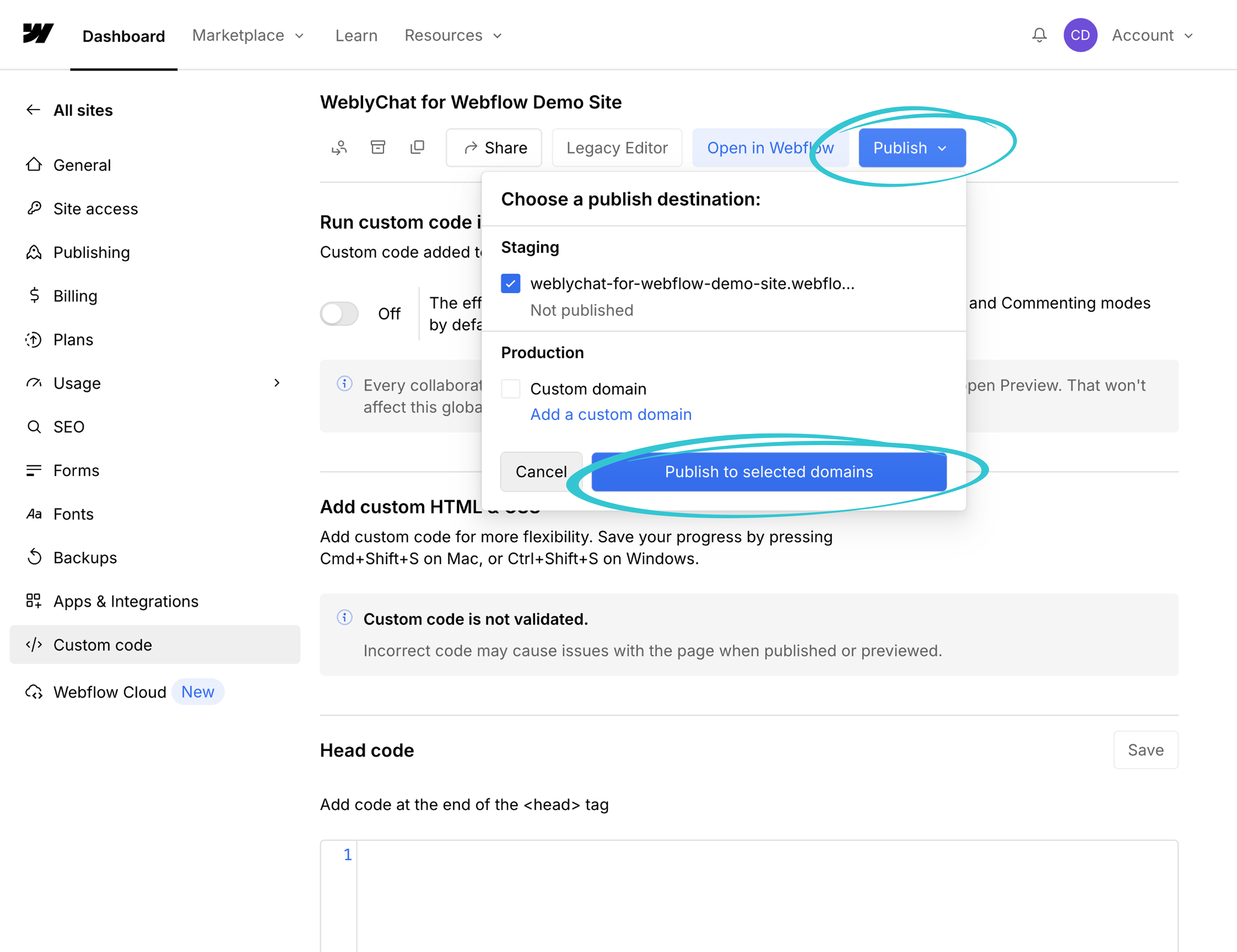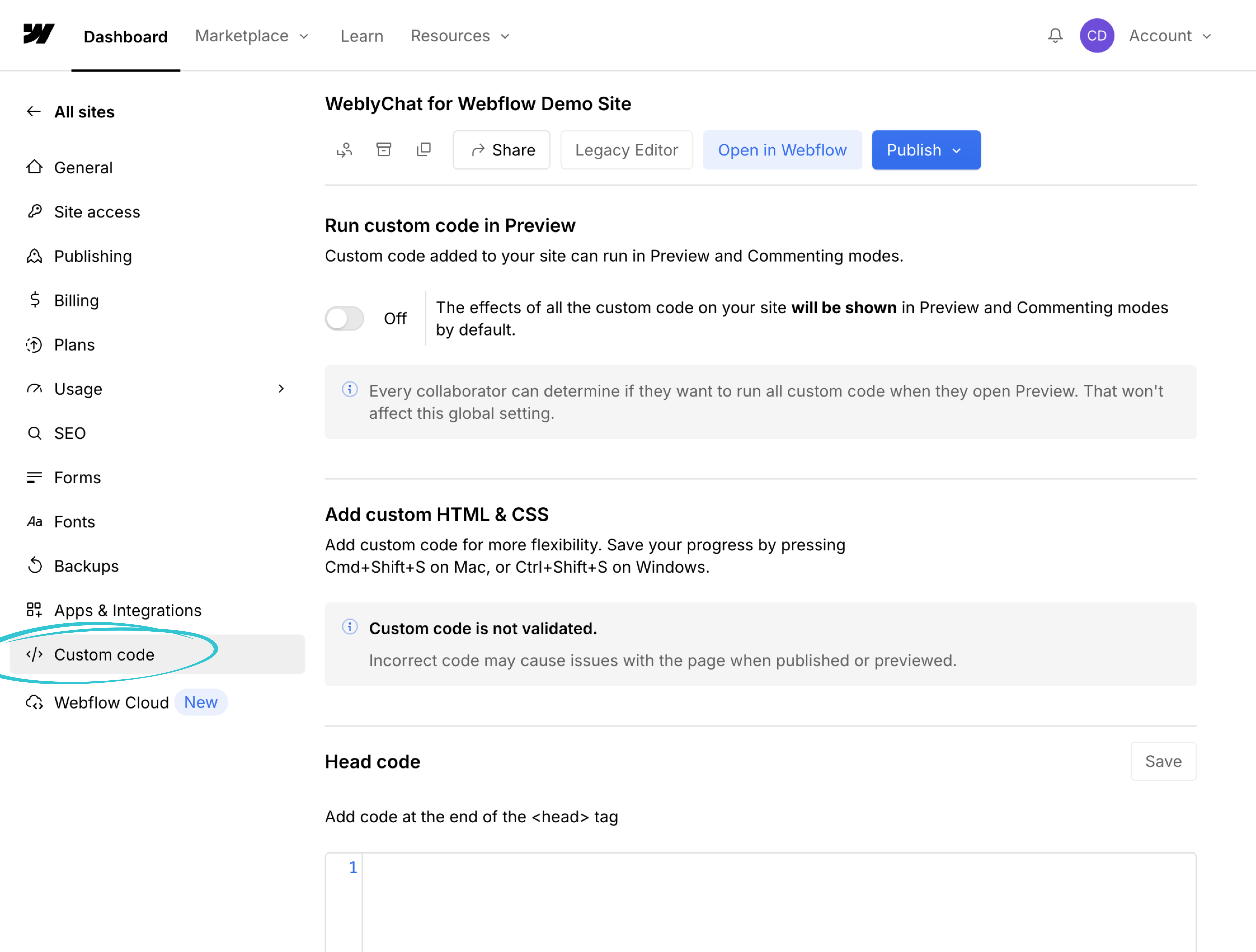 3. In the Site Settings sidebar, scroll down and click Custom Code.