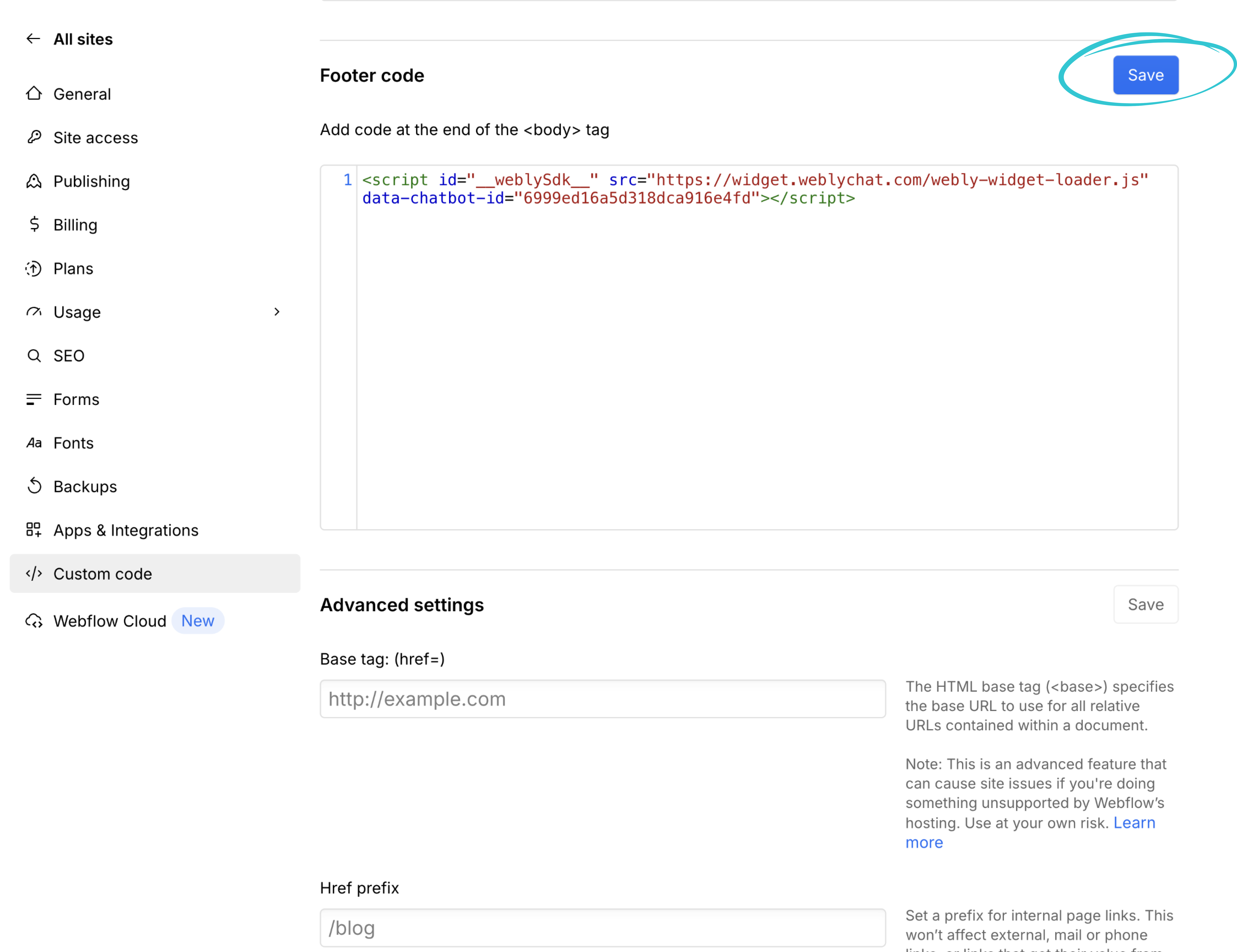 4. Scroll down to the Footer Code section. Paste your WeblyChat embed code into the text area. The Footer Code section adds your script to the end of the <body> tag on every page of your site, which is exactly where it needs to go. Then click Save.
